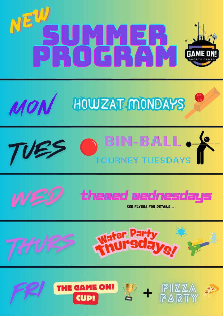 We’re excited to announce our Weekly Program for the upcoming summer holidays! Every day of GAME ON! is fun and full of varied activities, and each day is built upon a theme. Whether you’re into cricket, soccer, swimming, pizza or competing in team challenges or all of the above, we’ve got you covered…